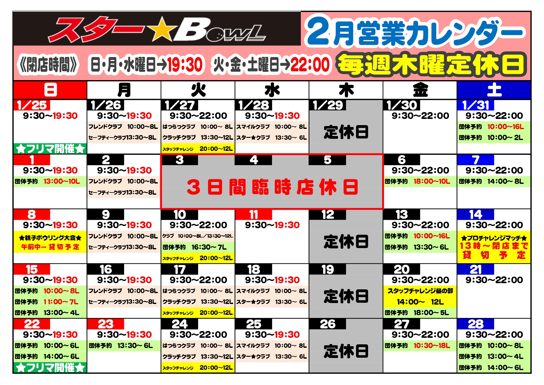 ★2月の営業時間及び混雑状況(団体予約・大会など)のご案内★