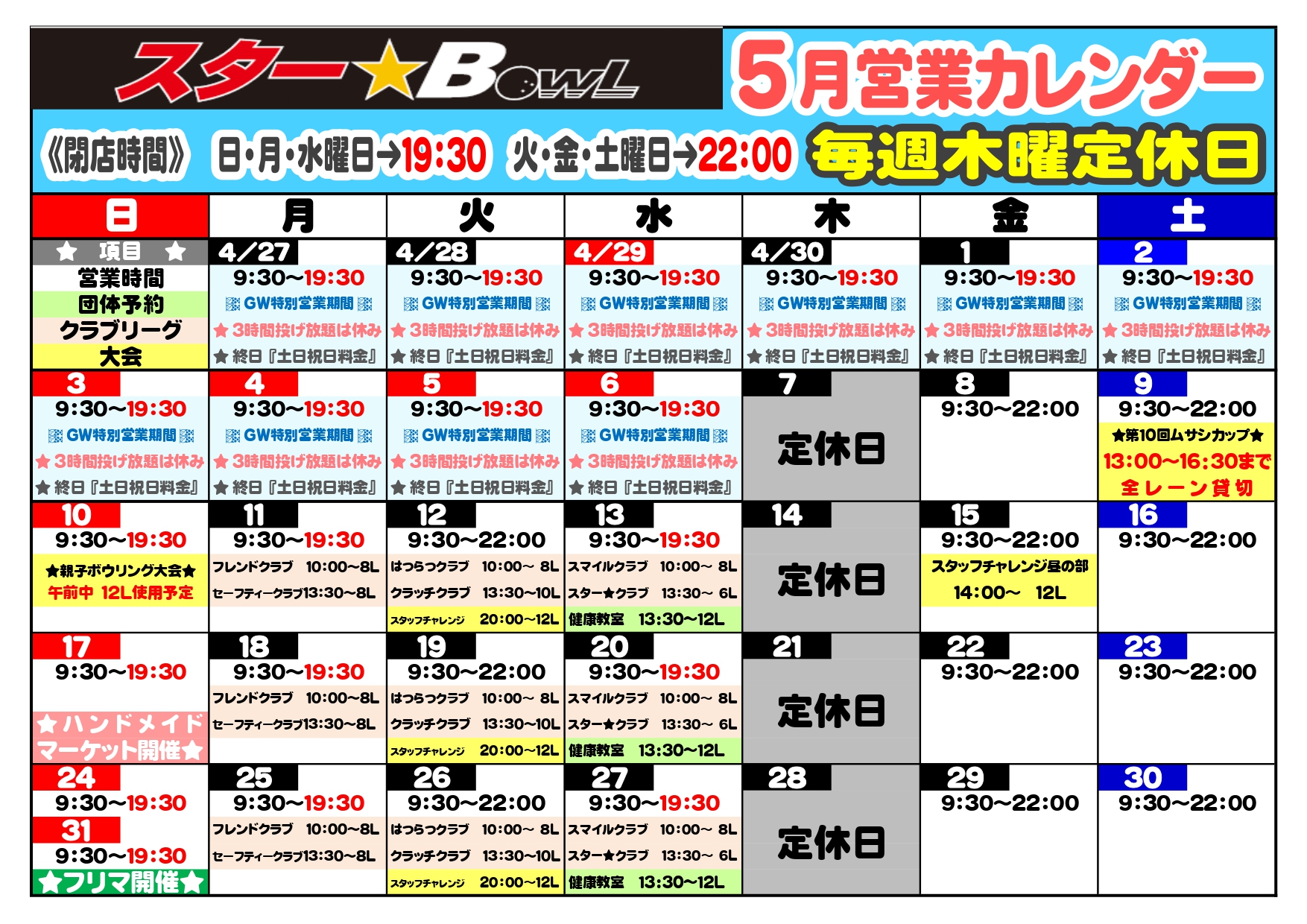 ★5月の営業時間及び混雑状況(団体予約・大会など)のご案内★